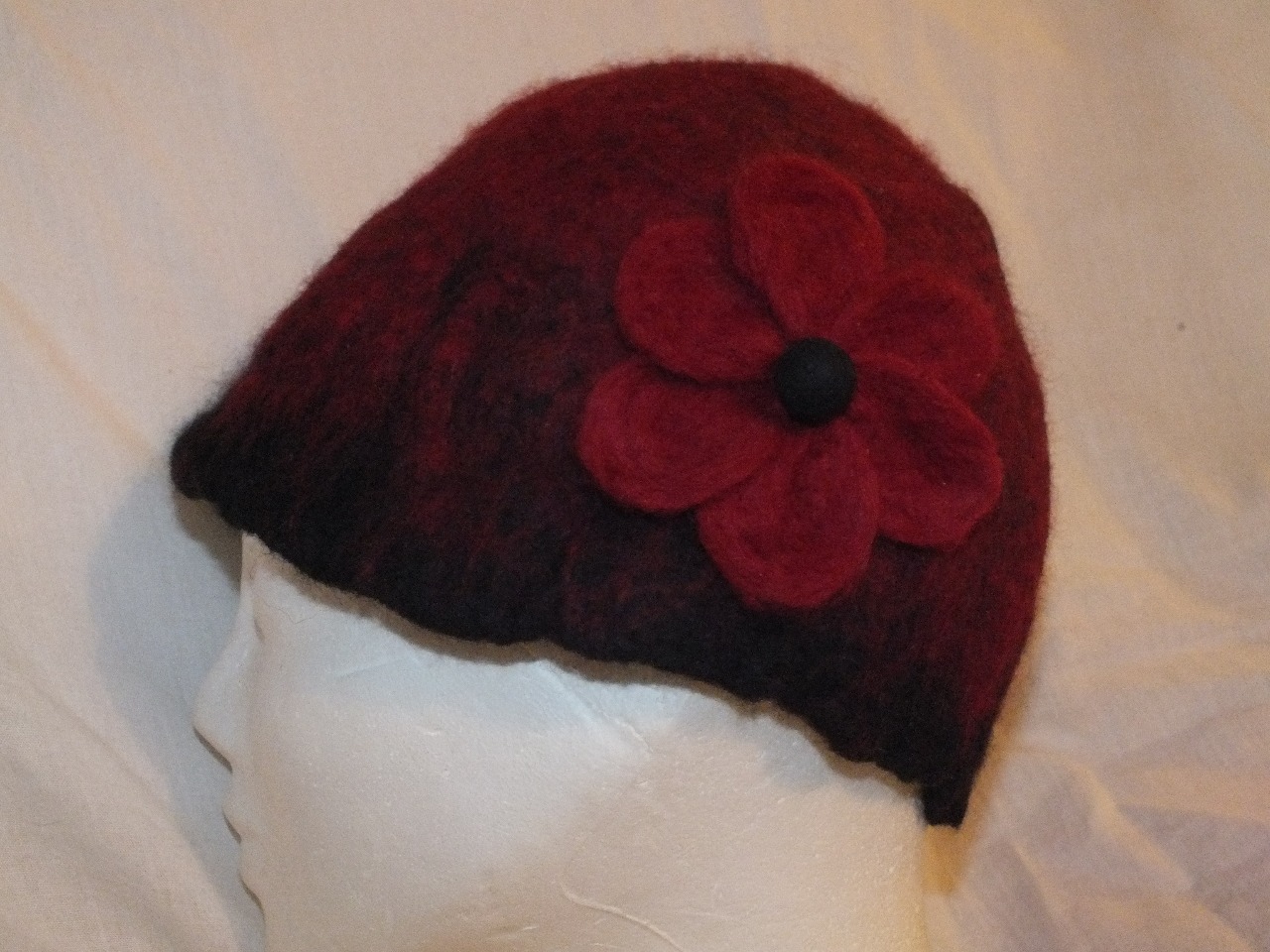 bordovo-čierna plstená čiapka vyrobená mokrým plstením,