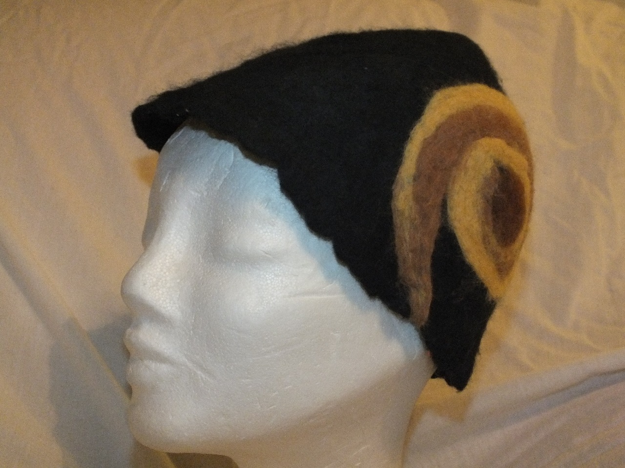 Čierny klobúčik vyrobený mokrým plstením, ozdobený hnedožltým ornamentom v tvare slimáka